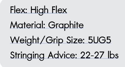 Flex: High Flex Material: Graphite Weight/Grip Size: 5UG5 Stringing Advice: 22-27 lbs